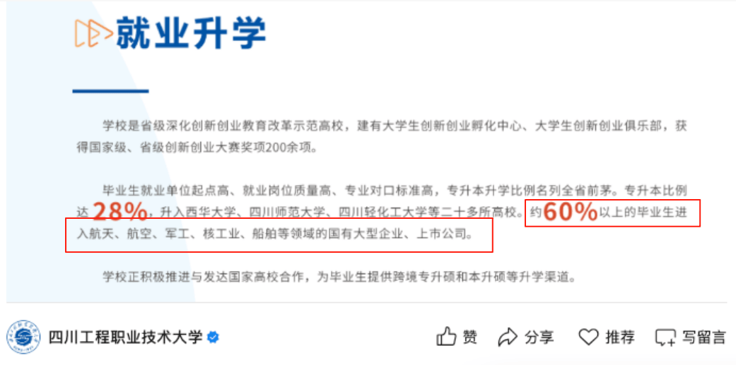四川工程职业手艺大学位于四川省德阳市,学校前身为建立于1959年的第一机械工业部德阳沉型机械制制学校,后历经多个成长阶段,正在2024年1月经教育部同意成为四川工程职业手艺大学。但若是你实的这么想,那就大错特错了!学校最新发布的就业数据显示:60%以上的结业生都能进入航空航天、军工、核工业、船舶等范畴的国有大型企业和上市公司。